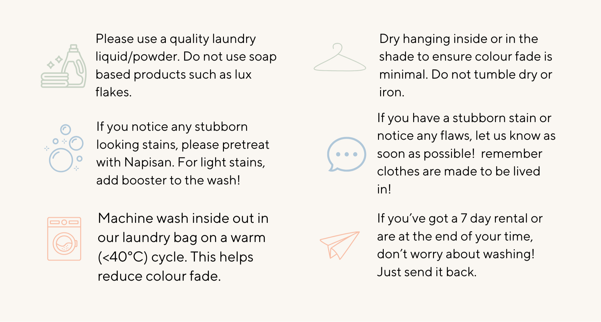 To ensure longevity of our items and optimal stain removal, we ask that you do not use soap-based detergents such as lux soap flakes. If you use this on your personal clothes, please wash our pieces separate. We have sample sizes of The Dirt Company washing liquid available to add to your order. For more information about why soap-based detergents aren't the best visit our friends at Clean Cloth Nappies.